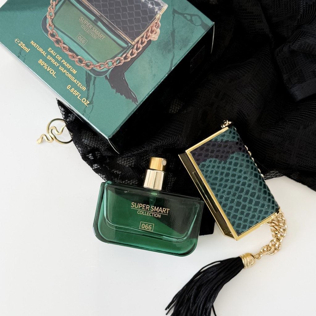در ابتدا با بوی شیرین و خوشمزه آلو سیاه شروع میشود که حضور مهربا در کنارش تلخی ملایم و حس شیرینی میبخشد پس از گذشت زمان کمی رایحه خس خس و گل زنبق به ترکیب اضافه میشود و کمی حس خاکی و دودی و دراین حال پودری اضافه میشو طراحی شیشه ی خاص که با روکش چرم پوست ماری تزیین شده و یک دسته ی زنجیری طلایی به بطری وصل شده که به شکل کیف دستی طراحی شده است
